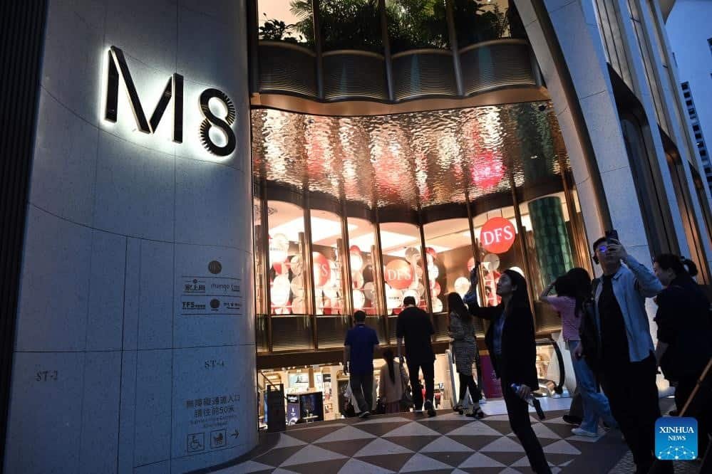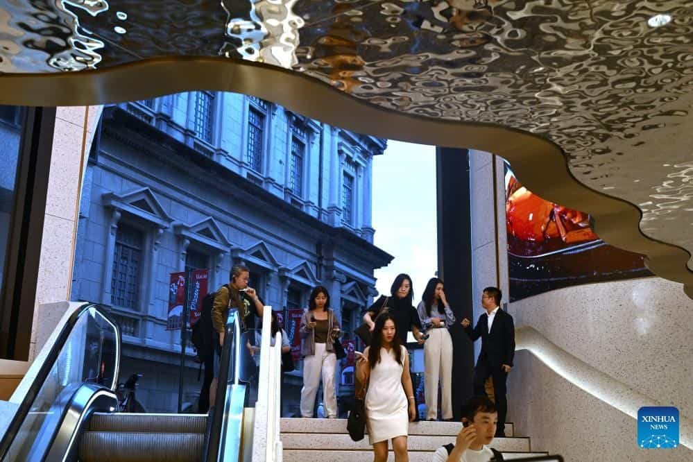 People walk into the M8 in Macao, south China, Nov. 15, 2024. Located at the heart of the historic center of Macao and just 50 meters from Senado Square, the M8, a key commercial urban redevelopment project in Macao, is expected to be open to the public at the end of November. (Xinhua/Jin Liangkuai)