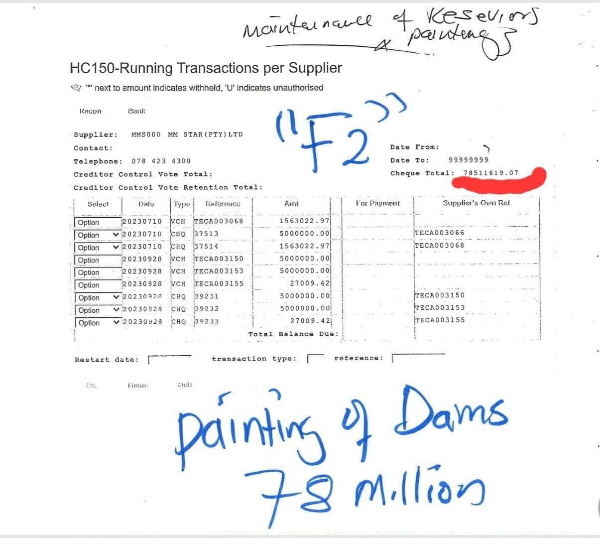 Whistleblower claims are now backed by leaked internal documents, including a resignation letter dated 28 July 2025 from Chief Financial Officer KA Ngomana, who quit under “intense pressure” as Hawks investigators circled the municipality. A supplier transaction reflecting a R78 million payment for painting dams—a figure experts say is highly inflated. An internal memorandum dated 15 April 2025, signed by Maluleka, authorising a R1.7 million legal payment to Popela Maake Attorneys—an amount critics say fits a pattern of inflated legal costs used to siphon public funds.
