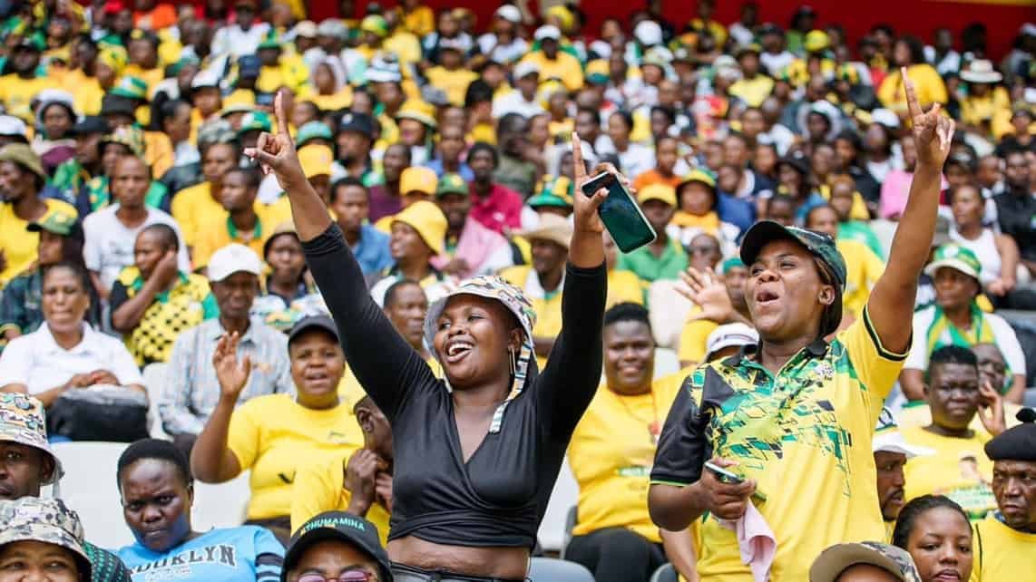 Jubilant ANC members in high spirit during the party's 112 anniversary rally at Mbombela Stadium in Mpumalanga.